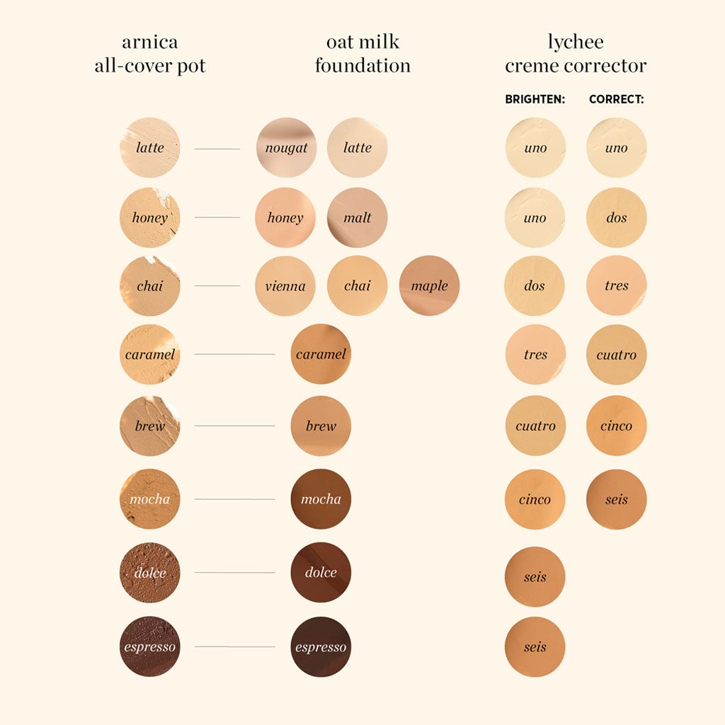 Pair with Oat Milk foundation or wear on bare skin. Use to cover marks and brightens the under-eye area & doubles as a highlighter/contour.