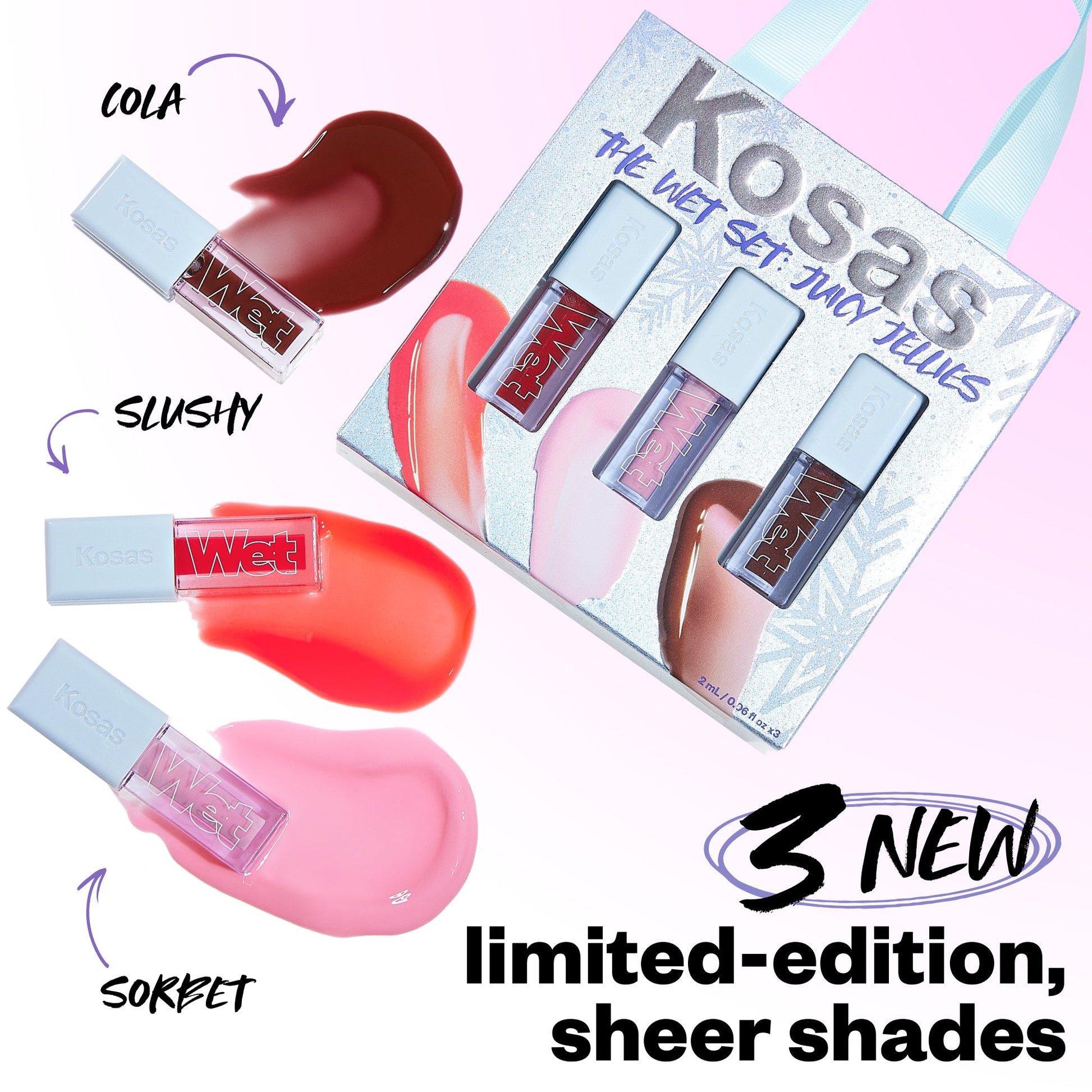 The Kosas The Wet Set Juicy Jellies is a trio of limited edition sheer, juicy shades of the bestselling peptide lip treatment, lip oil and gloss in one.